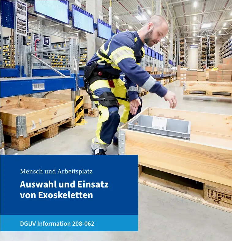 Die “DGUV Information 208-062 Mensch und Arbeitsplatz – Auswahl und Einsatz von Exoskeletten” bietet eine praxisnahe Grundlage zur Bewertung von Exoskeletten. Sie enthält eine Schritt-für-Schritt-Anleitung mit Checklisten, Leitfragen und Empfehlungen, um fundierte Ergebnisse zu sichern und die Auswahl eines geeigneten Systems zu unterstützen.